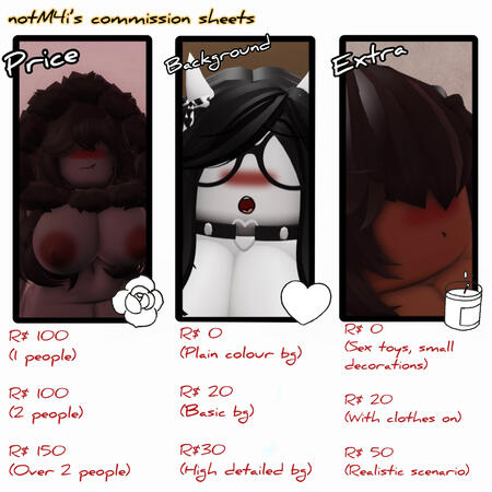 If you are interested in commissioning me, then you must need to know some basics.The first thing is I don't do gore, mechs, or any furry commissions.The second thing is I usually complete your commission within 1-7 days, if I am on vacation or a holiday, I will notify you before accepting your commission so you don't have to wait for so long.Last thing, the price is not negotiable, I only accept Robux.
